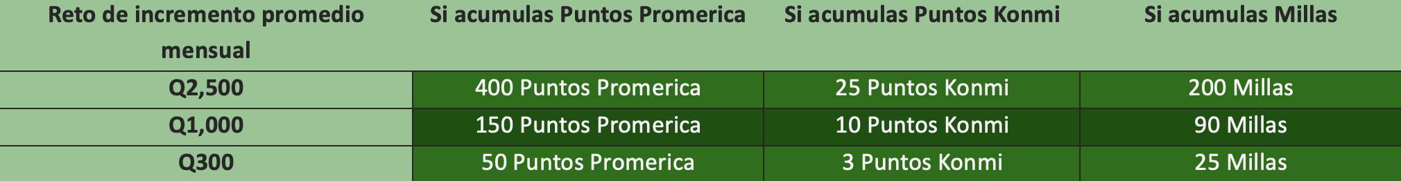 • Tu reto: Recibe 150 Puntos Promerica, por cada Q1,000 de incremento de saldo promedio.