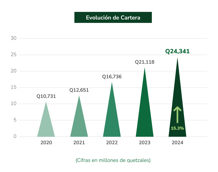 Al 31 de diciembre de 2024, la Cartera de Préstamos del Grupo Financiero Promerica superó los Q24,341 millones, aumentando un 15.3% con respecto al año anterior y por encima del 12% del crecimiento promedio mostrado por las instituciones bancarias del país.