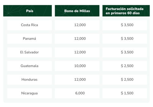El cliente que adquiera una tarjeta Avianca lifemiles Visa durante la vigencia y realice consumos mínimos acumulados de USD $2,500 en los primeros 60 días naturales posteriores a la entrega de la tarjeta, recibirá un bono de 10,000 millas lifemiles. Las millas serán acreditadas 60 días después de cumplir con el consumo mínimo. El bono permitirá redimir un tiquete ida y vuelta en tarifa Basic, clase X, desde Guatemala hacia Miami (EE. UU.), sujeto a disponibilidad.