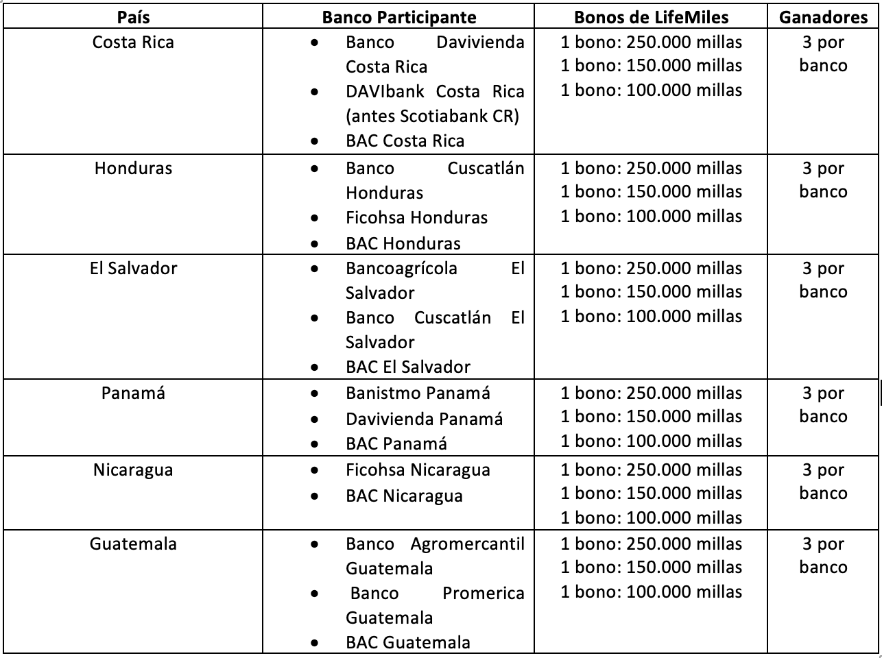 - Podrán participar de la Promoción, los socios lifemiles que sean personas naturales que cumplan la totalidad de los siguientes requisitos: Tener una tarjeta de crédito de personas Avianca lifemiles Visa activa, emitida por uno de los Bancos Participantes: Banco Davivienda Costa Rica, DAVIbank Costa Rica (antes Scotiabank Costa Rica), BAC Costa Rica, Bancoagrícola El Salvador, Banco Cuscatlán El Salvador, BAC El Salvador, Banco Agromercantil Guatemala, Banco Promerica Guatemala, BAC Guatemala, Banco Cuscatlán Honduras, Ficohsa Honduras, BAC Honduras, Ficohsa Nicaragua, BAC Nicaragua, ,Banistmo Panamá, Davivienda Panamá, BAC Panamá (“Participantes”, “Tarjetas Participantes” y “Bancos Participantes”) y realizar transacciones con la misma tarjeta que cumplan con las condiciones descritas más abajo durante la Vigencia de la Promoción en la región. Quedan excluidas de la Promoción las Tarjetas de Crédito Avianca lifemiles Visa Pyme y Corporativas y las Tarjetas de Débito Avianca lifemiles de la región.