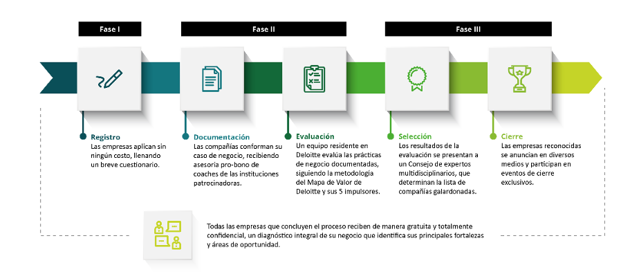 Esta edición tuvo como resultados 134 empresas registradas; de ellas, 81 continuaron a la fase de documentación, en la que trabajaron su caso de negocio bajo la metodología del programa, basada en los 5 impulsores del Mapa de Valor de Deloitte y sus 36 dimensiones de gestión. A lo largo de esta etapa, las compañías fueron asesoradas por un grupo de coaches expertos, provenientes de las tres instituciones promotoras. Cincuenta y tres organizaciones concluyeron su caso de negocio y fueron evaluadas, siendo el 66% de ellas empresas familiares.